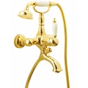 Назначение: ванна+душ • Конструкция: однорычажный • Монтаж: вертикальный • Материал: покрытие - золото • Подводка: жесткая • Монтажные отверстия: 2 отверстия • Форма излива: традиционная • Душевая лейка в комплекте: есть • Держатель для душевой лейки: на смесителе