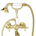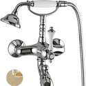 Назначение: ванна+душ • Конструкция: однорычажный • Монтаж: вертикальный • Материал: покрытие - золото • Подводка: жесткая • Монтажные отверстия: 2 отверстия • Форма излива: традиционная • Душевая лейка в комплекте: есть • Держатель для душевой лейки: на смесителе • Донный клапан в комплекте: есть