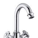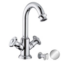 Назначение: для умывальника • Конструкция: двухрычажный • Монтаж: горизонтальный • Материал: латунь, покрытие - хром • Подводка: гибкая • Монтажные отверстия: 1 отверстие • Форма излива: традиционная • Душевая лейка в комплекте: нет • Аэратор: есть • Донный клапан в комплекте: есть