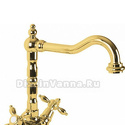 Назначение: для умывальника • Конструкция: двухрычажный • Монтаж: горизонтальный • Материал: латунь, покрытие - золото • Подводка: гибкая • Монтажные отверстия: 1 отверстие • Форма излива: традиционная • Душевая лейка в комплекте: нет • Аэратор: есть • Донный клапан в комплекте: есть