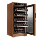 Тип: однокамерный винный шкаф • Расположение: отдельностоящий • Количество компрессоров: 1 • Цвет: под дерево • Размеры (ШxВxГ): 655x1310x610 мм • Количество дверей: однодверный • Винный шкаф: 66-100 бут. • Управление: цифровой дисплей, электронное • Холодильная камера: полка для бутылок x 5 • Материал полок: дерево • Годовой расход энергии: 292 кВтч