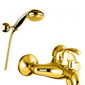 Назначение: ванна+душ • Конструкция: однорычажный • Монтаж: вертикальный • Материал: покрытие - золото • Подводка: жесткая • Монтажные отверстия: 2 отверстия • Форма излива: традиционная • Душевая лейка в комплекте: есть • Держатель для душевой лейки: настенный держатель • Аэратор: есть • Эксцентрики в комплекте: есть • Донный клапан в комплекте: есть