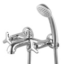Назначение: ванна+душ • Конструкция: двухрычажный • Монтаж: вертикальный • Клапан: керамический • Материал: покрытие - хром • Подводка: жесткая • Монтажные отверстия: 2 отверстия • Форма излива: традиционная • Душевая лейка в комплекте: есть • Держатель для душевой лейки: на смесителе • Аэратор: есть • Эксцентрики в комплекте: есть • Донный клапан в комплекте: есть