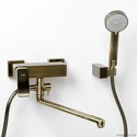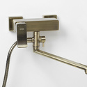 Назначение: универсальный • Конструкция: однорычажный • Монтаж: вертикальный • Клапан: керамический • Материал: латунь, покрытие - бронза • Подводка: жесткая • Монтажные отверстия: 2 отверстия • Форма излива: традиционная • Душевая лейка в комплекте: есть • Держатель для душевой лейки: настенный держатель • Аэратор: есть